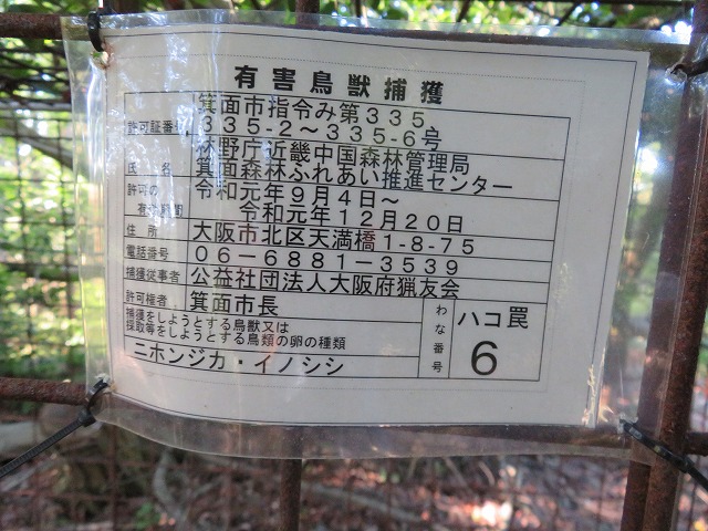 先へ歩いていくとフェンス沿いに箱罠があり、そこには害獣捕獲許可証が張ってありました。