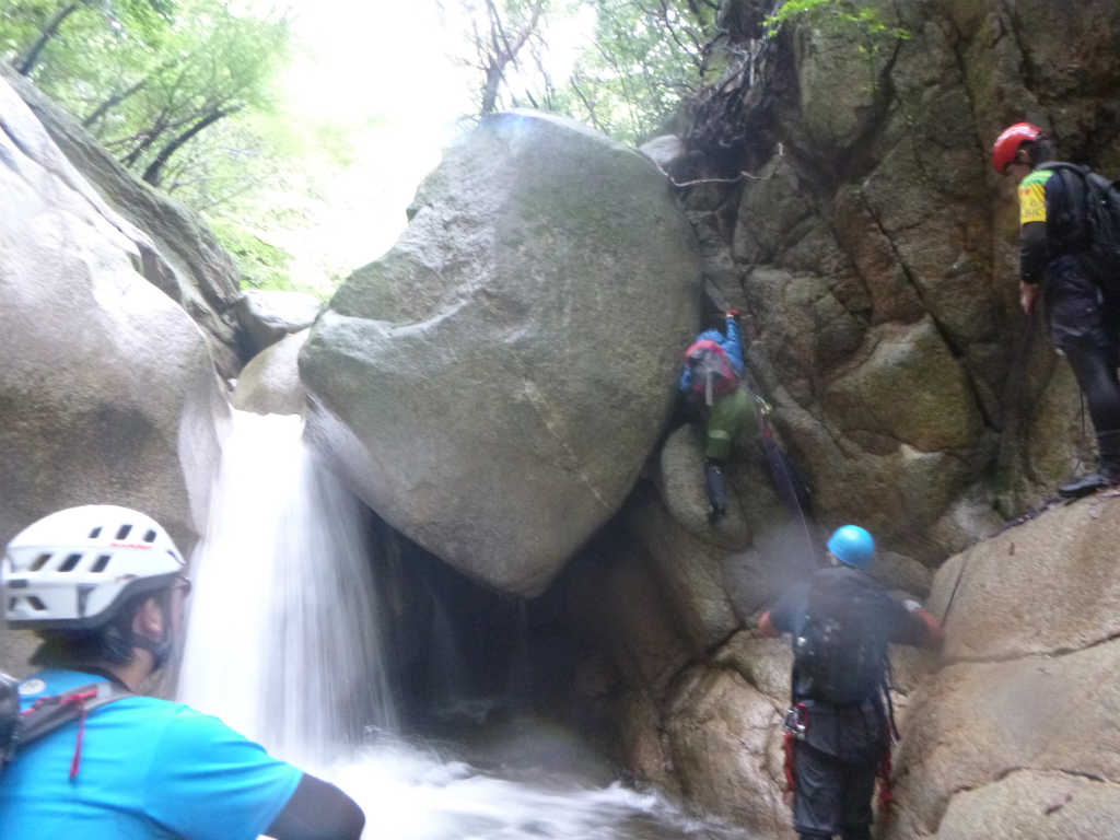 七ツ釜の廊下は流れを突っ切って侵入し、最後は大岩の右側を登る。切り込み隊長のなおちゃんがロープをつけて登る。一度落ちるがなんとか登頂に成功、後のメンバーを引き上げる。昨日からの雨で増水しているので難度が上がって楽しい.