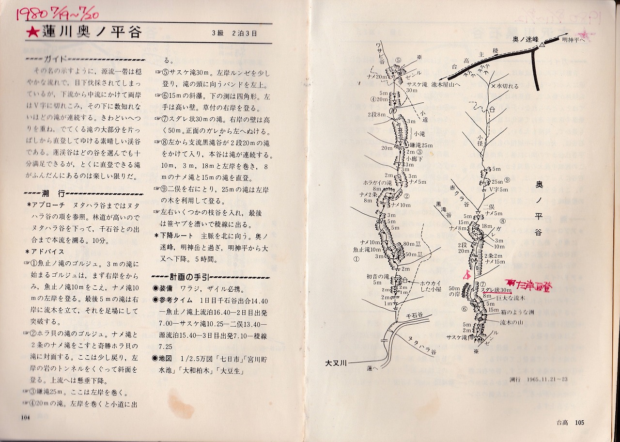 私が遡行したのは35年前。当時一緒に沢を始めた連れと2人で行きました。沢登りを始めてまだ1ヶ月の頃。私が行ったのはその10年後。当時パウチする機械が出回り始めて、遡行図を縮小コピーしてパウチして首からぶら下げていました。