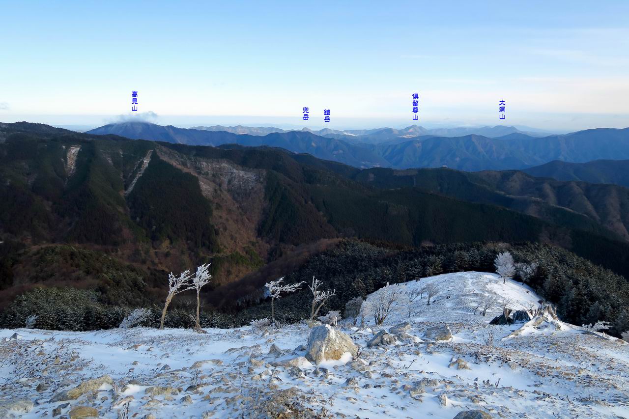 予報どおり朝早くから晴れており、太陽も昇ってきたので樹氷が落ちることが心配で予定を変更し、マナコ谷登山口(標高760m)からまず桧塚に登ることにした。マナコ谷の左岸に取り付きがあり、植林帯の中をジグザグを切りながら登っていく。途中に明確な作業道(杣道)があるが、登山道はこれを何度も横断しながら登っている。やがて造林小屋に出会うと、支道を右に取って少し進むと植林と自然林の境界線を登っていくことになる。このあたりから雪が出てきた。どうやら昨日のものと思われる複数人のトレースがある。気温が低かったせいか、踏み跡が今もはっきりと残っている。やがて樹林の中から飛び出した。広々とした尾根が桧塚のある主稜線に続いている。雪面に残ったトレースを追いながら一歩ずつ登っていくと、景色が広がってくる。前方には樹氷のついた樹木が「おはようごさいます」と出迎えてくれる。右手には、台高主稜線にある水無山、国見山、赤ゾレ山と連なって見えているが、後ろを振り返ると、台高山脈北端の高見山があり、その尾根筋には三峰山、修験業山、栗ノ木岳、局ヶ岳などが続いている。その向こうには特徴ある室生火山群の住塚山、鎧岳、兜岳、倶留尊山、大洞山が並んでいる。主稜線に出ると樹木にたくさん樹氷がついているが、風も少しあって寒く、手がかじかむ。まずは桧塚にあいさつに行くことにした。少し下って登り返すと桧塚の三角点が雪の中にあった。