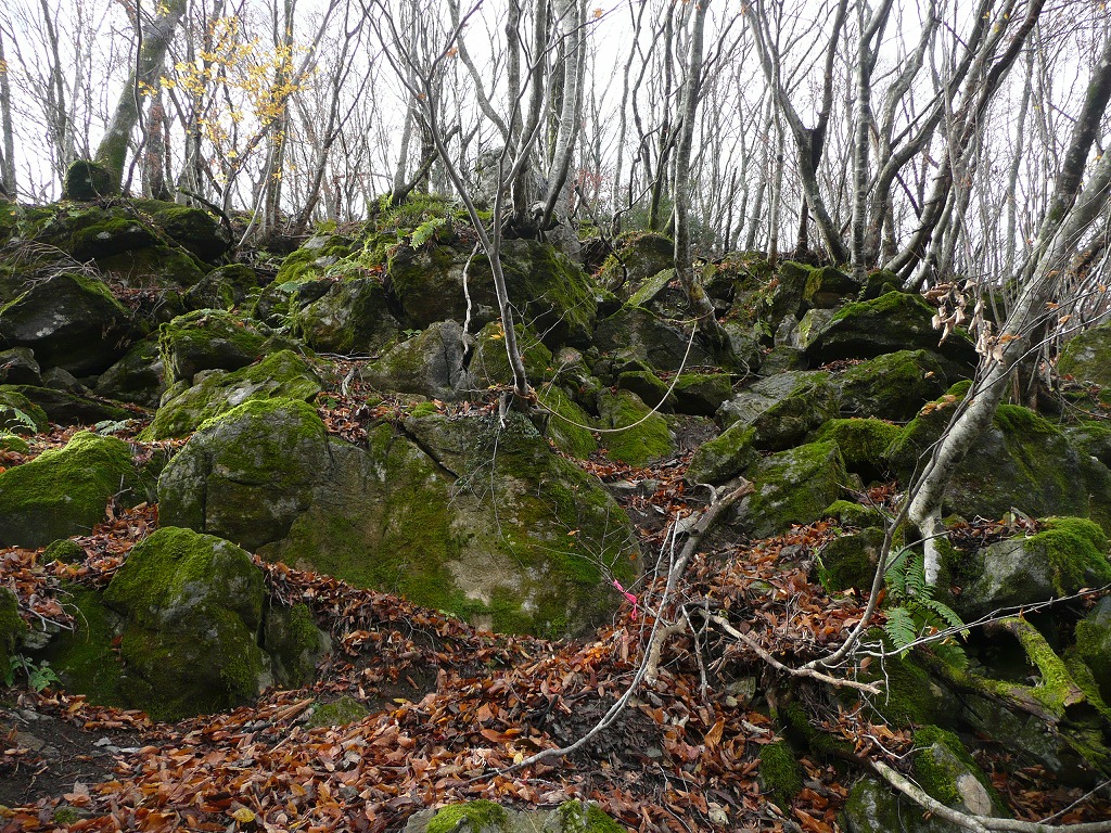 単調かと思っていたこの尾根道だが途中でずいぶん岩が出てくる。ちょうど御池の斜面を登っているときに出会う岩と同じように苔むしていてなかなか風情がある。