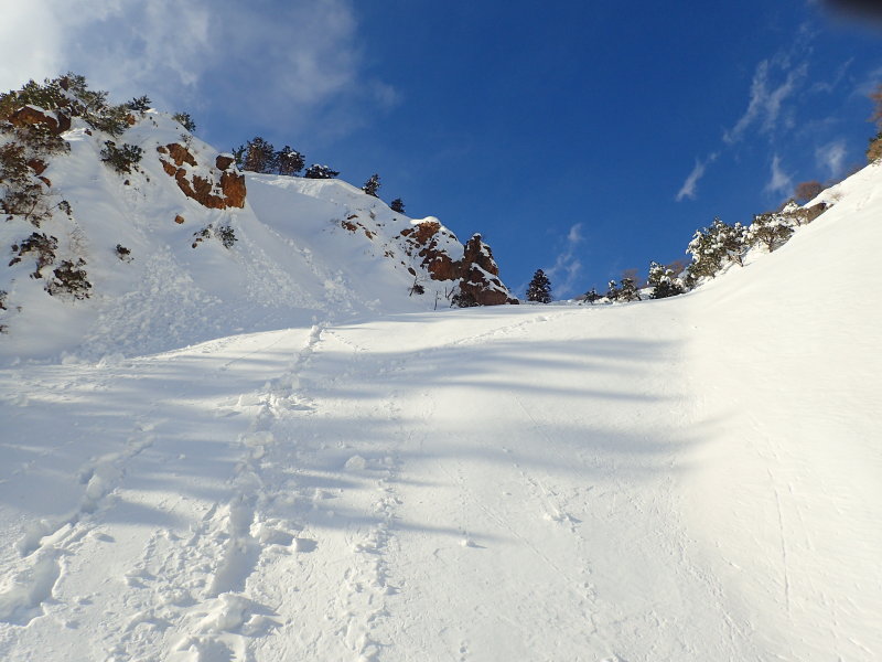 この2日間でたっぷり雪の供給があったようで、谷沿いの道は十分の積雪だ。多くの先行者のトレースで