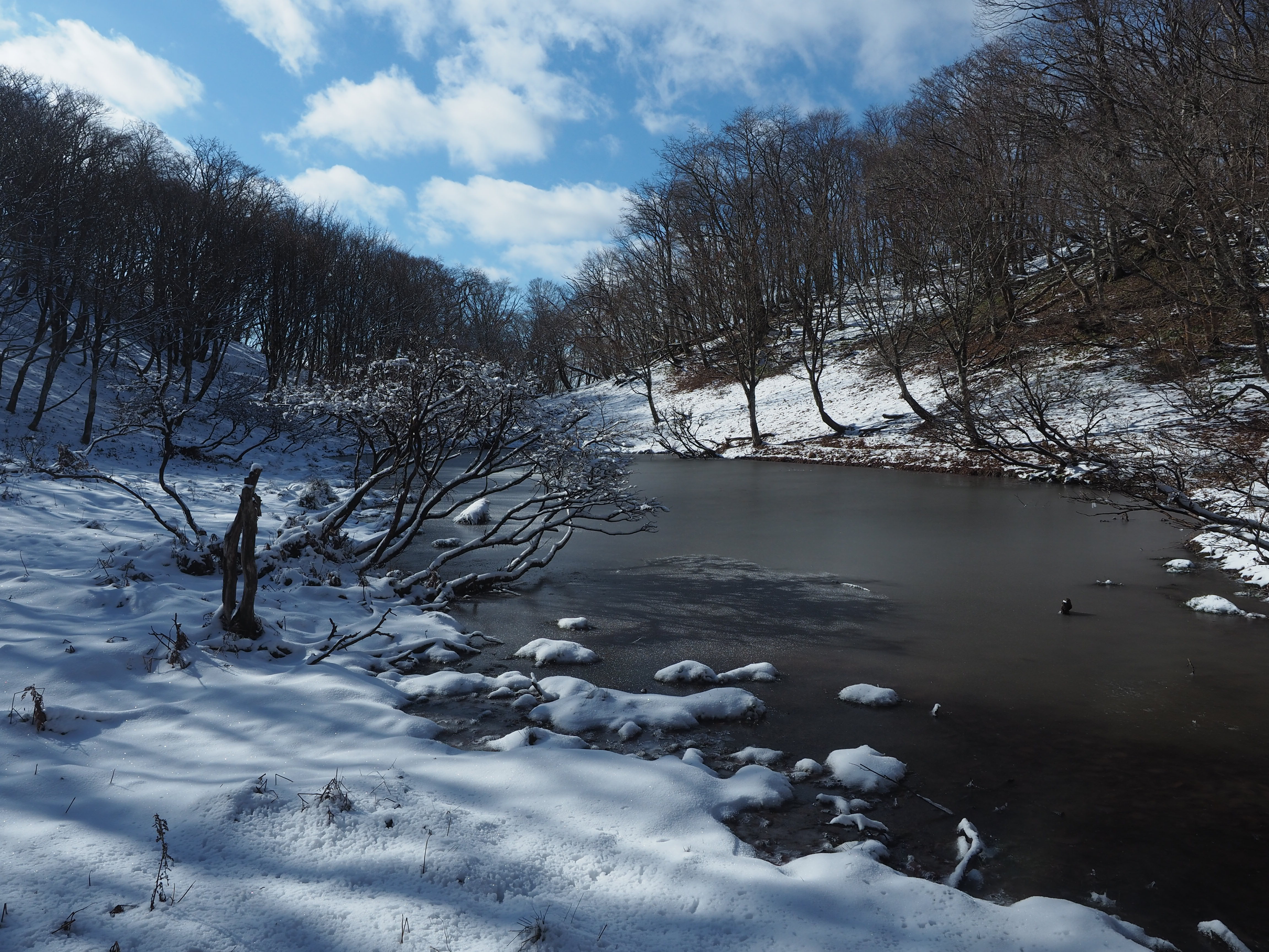再び少し東に戻り、小さな鞍部を越えて南側の谷に出ると谷に沿って広い水溜まりがある。谷沿いに再び西に進んでもう一つの池に辿り着く。ここは薄氷が均一に水面を覆っているが、氷の厚みのせいだろう、池の中央部には乳液を落としたかのような大きな白いまだら模様を描いている。