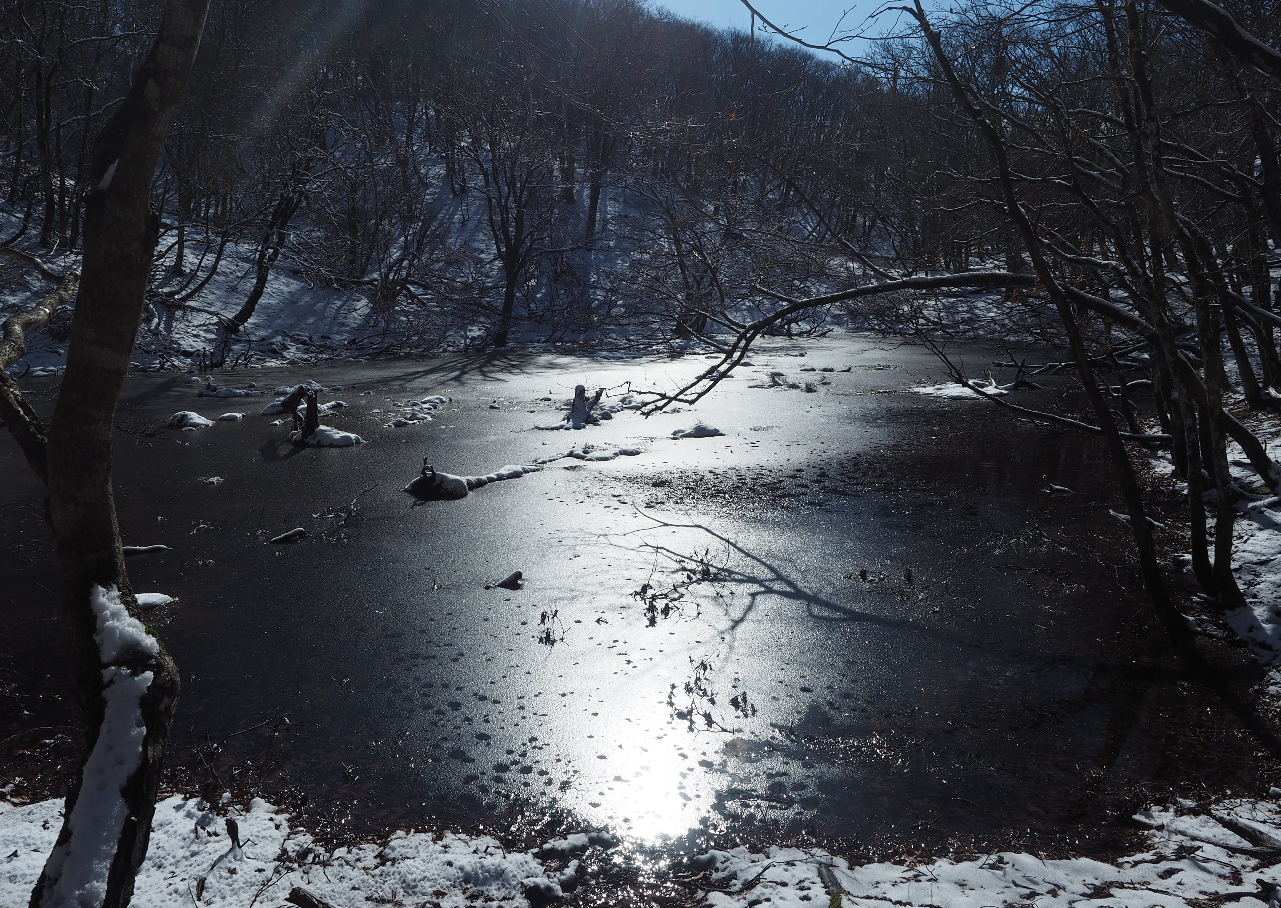 斜面を下って再び音羽池の畔に立つと、池には明るい陽光が降り注ぎ、凍った水面にはブナの樹のシルエットが伸びている。光があたったすりガラス状の水面は燻し銀のような輝きを見せる。池の下からは聞こえてくるブツブツという音はますます賑やかさを増しているようだ。