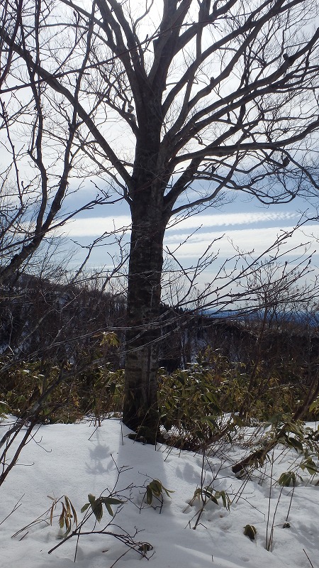 ここからは平坦な尾根を進む。少ない積雪のせいでササや灌木の枝が鬱陶しい。