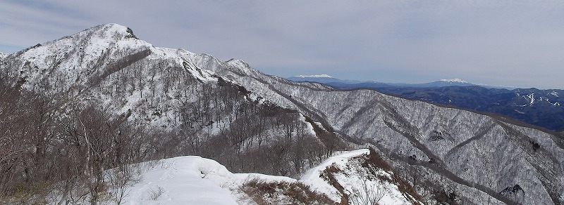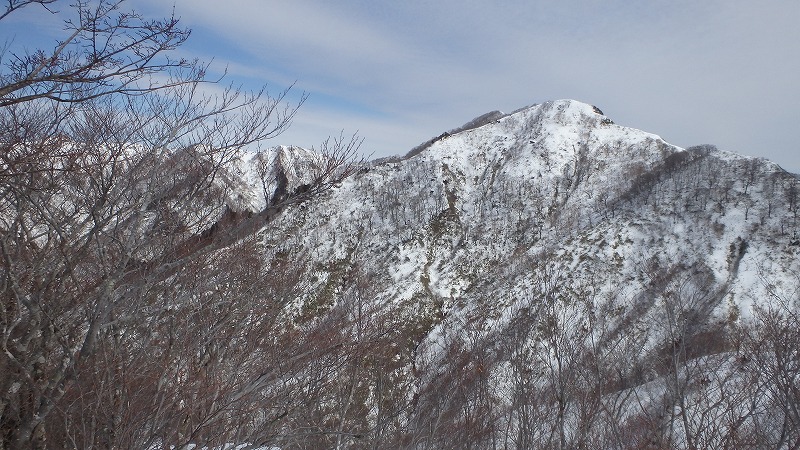 残雪も安定し、ヤブもなくなった稜線歩きは快適なのだが、斜度が増し、林道歩きの足の疲れもあってかピッチが上がらない。