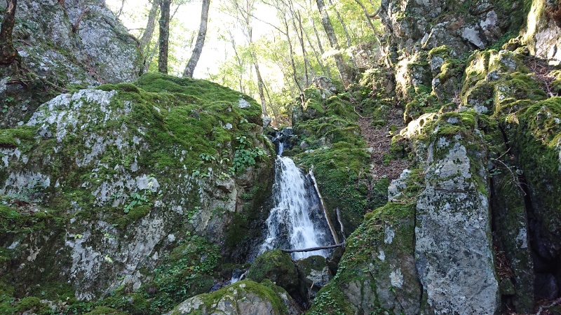 高度差50メートルくらい下ると、等高線が詰まって来る。美しい優美な滝を右手に垣間見ながら、左岸の踏み跡を辿る。 奥ワサビ谷は、なんていうか、凛とした感じの控えめな美しさがある。