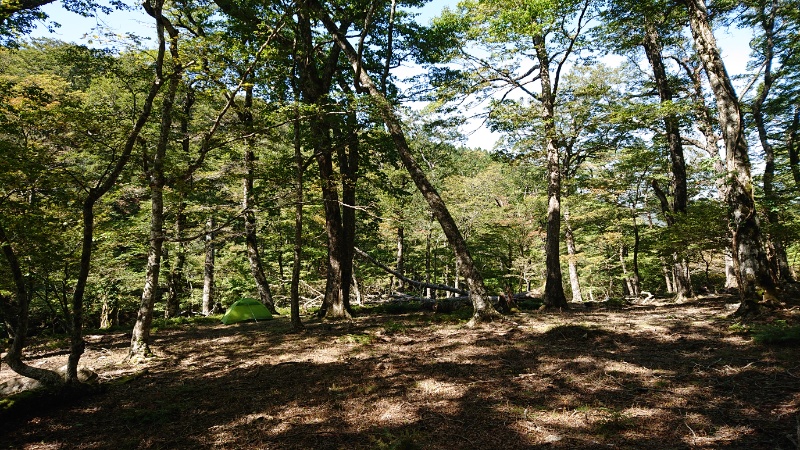 奥峰に立ち寄ってからテント場に戻る。再び木漏れ日の差す森が美しい。テントはどこだっけ。森をさ迷うも楽しかった。それくらいここはゆったりしてますね。