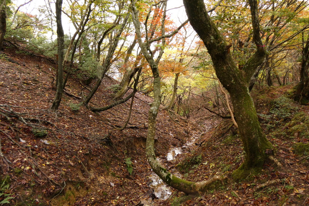 >峠からまっすぐ下ってしまうのも芸がないのでブナ清水に立ち寄ることにする。紅葉はまだまだこれからで、