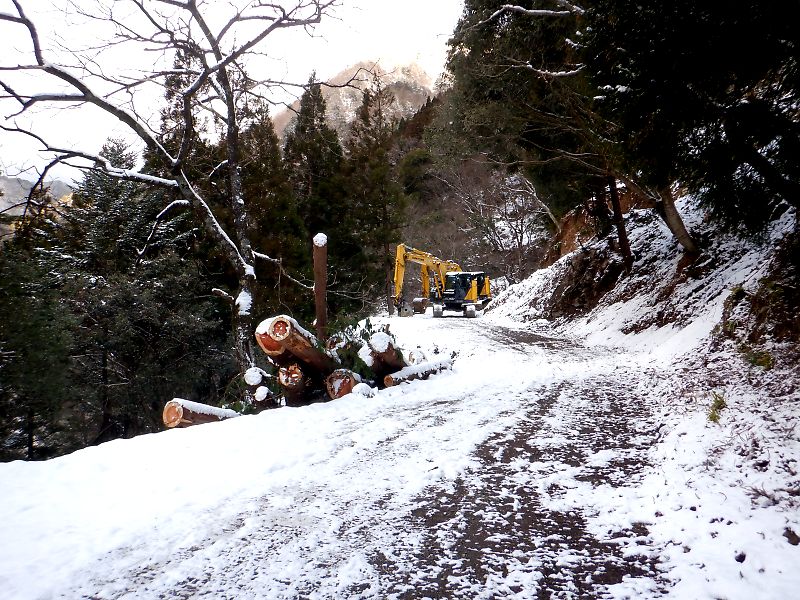 大型削岩機とパワーシャベルが鎮座していた。山仕事の作業道を付けているところだ。