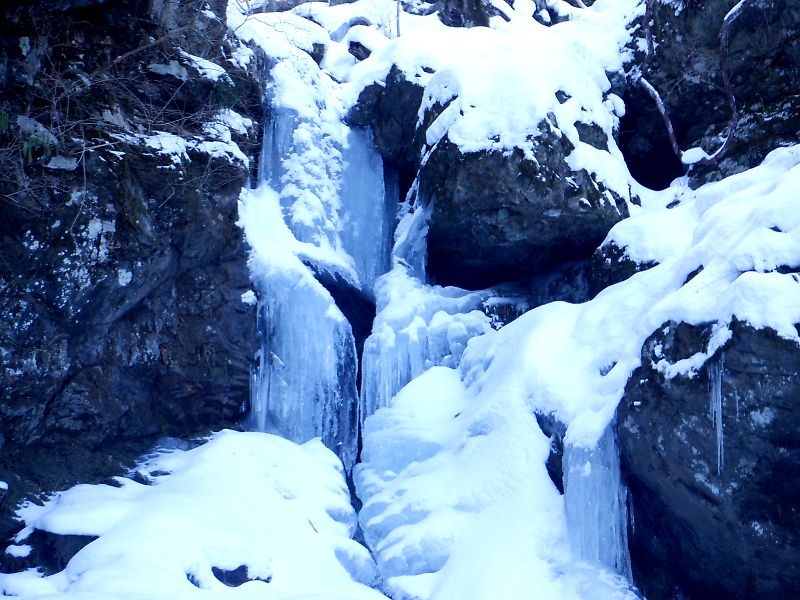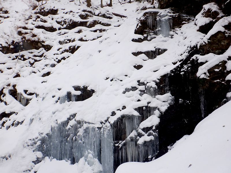 スダレ滝は雪をかぶって氷瀑に見えない。いつものことである。