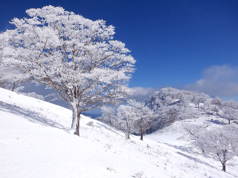 登りついたとたんに溶け落ちる霧氷の洗礼を受けるのが常である。