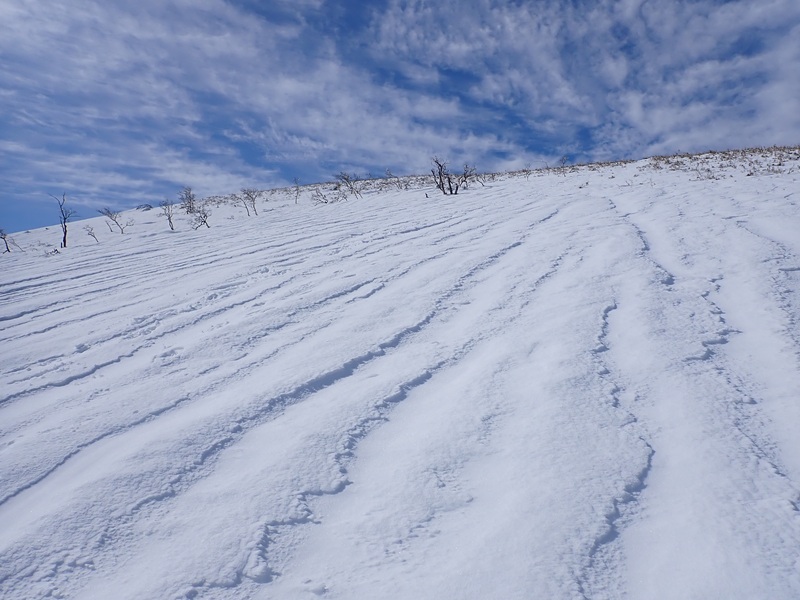 東雨乞の最後の上りはクマザサが深く中途半端な雪だと落とし穴地帯になってしまうが、大丈夫で、雪原についた縦じまのシュカブラとウロコ雲が絶妙な景色を織りなしていた。