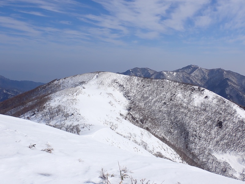 東雨乞からは真っ白な雨乞岳と四方に広がる稜線が見えている。山頂にも杉峠につながる尾根にも人の影はなく、この日は滋賀県側からの登山者に出会わなかった。たいした沈み込みもなく到達した山頂からは大峠からつながる綿向山がまるごと見える。