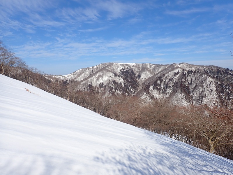 コクイ谷分岐手前で石と倒木を使って渡渉し、対岸の尾根に取りつき七人山東峰の北東尾根をスノーシューで上るが雪尾根は思ったよりも狭く感じた。七人山雪原を歩き七人山に近づくと青空を背景に東雨乞のドームの壁が迫ってくる。コルに下ると深い大きな溝道が出てくるが雪の厚みでいつものような迫力がない。天気も良く展望も抜群で、東雨乞上部のハゲからは、正面にイブネ台地が横たわり、根の平方面には尾根を広げた釈迦ヶ岳が見える。七人山の奥に御在所岳、鎌ヶ岳はきれいに見えるが、暖かく空気が澄み切っていないので津の造船所のドックは見えなかった。東雨乞の最後の上りはクマザサが深く中途半端な雪だと落とし穴地帯になってしまうが、大丈夫で、雪原についた縦じまのシュカブラとウロコ雲が絶妙な景色を織りなしていた。