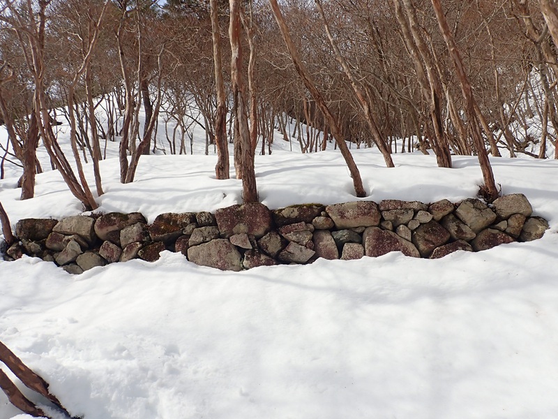 ノートレースの溝道をひろいながら雪に埋もれた飯場跡につくと、石垣が顔をのぞかせ、神崎川の源頭の雪解け水が音を立てて流れていた。冬でも調達できる水場が、飯場が置かれた理由なのだろう。神崎川流域には御池鉱山、高昌鉱山、国位鉱山、大蔵鉱山があり明治から昭和初期にかけて大いに賑わった、この流域の窯跡が巨大なのは精錬に必要だったからだろう。雪の鉱山跡はまた趣きがあるでしょうね。かつては学校まであり、多くの人が働き生活していたとは想像もできないですね。