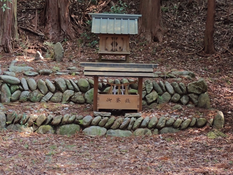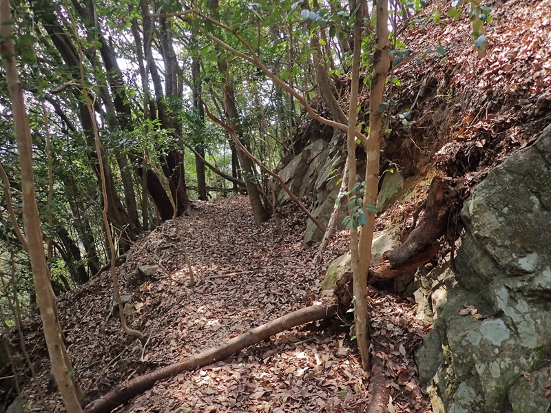 登山口を少し上ると鳥居の奥に金毘羅さんがある。海上交通の守り神として信仰されてきた金毘羅権現だが、出江が櫛田川水運の要衝であったことから祀られたのだろう。祠横には自然石が二つ置かれ、山の神のようだ。尾根道は自然林で明るく様々な木が生えている、田園を見渡せる稜線のナワシログミの木が印象的で、苗代を作る時期に実がなる。ひと上りで平坦な南砦で田古加山と呼ばれ、高野山で枝を束ねてほうきにしたコウヤボウキが茂っていた。