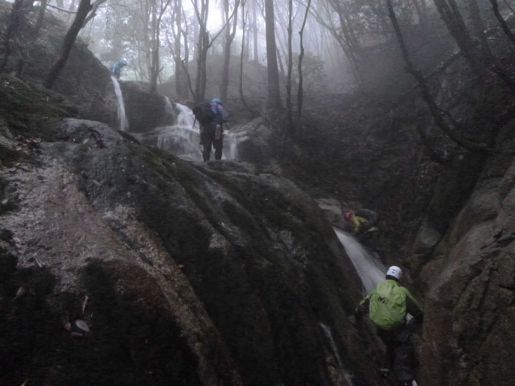 このあとは連瀑帯になっているのだが,雨とガスで谷中は暗くなり,ひたすらもくもくと滝を登り続ける.晴れていれば楽しいところなんだろうけど.