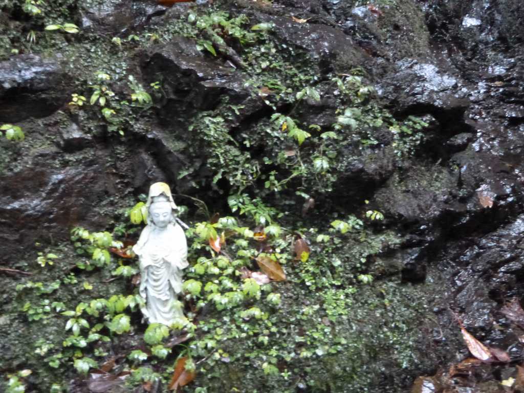 観音滝。雨子庵さんに置物があるはずなので見てきてほしいと頼まれていたので、滝下へ見に行くと観音様の置物があった。これが雨子庵さんが言っていたものだろうか?コレコレ。昔見たときはマイセンかなんか洋物かなと記憶があいまいでしたが、よく見ると観音さまなんですね。