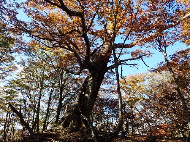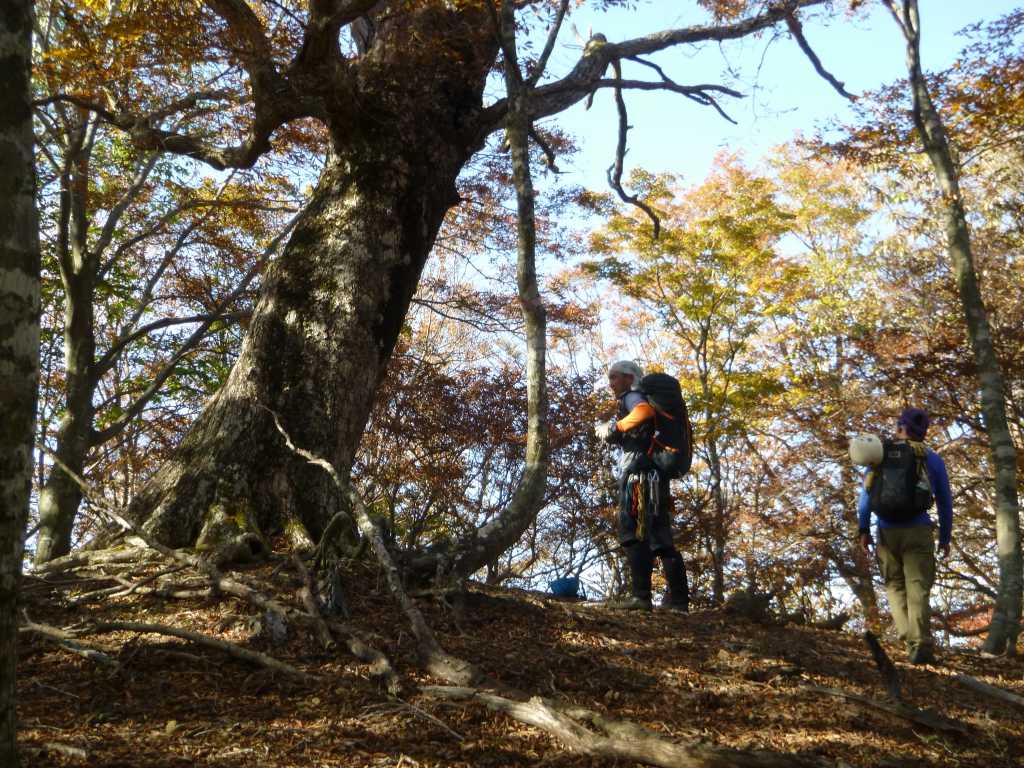 稜線で短い昼食休憩をとったあと,P1226に向けてちょっと歩くと単独のSさんが休んでいた.下山方向は同じなので,この後一緒に歩くことになる.歩きながら話をしているとこの人の経歴がすごかった.あらゆる谷をほとんど単独で遡行している。我々が苦労した奥の平谷を単独で1日で抜け,サスケ滝も単独登攀したという.4級沢の岩井谷も単独で遡行している.岩井谷は私など下から見ただけでとても自分が登れる谷ではないとはなから諦めたのに.なんの木平のミズナラ大王にご挨拶だけして,下山する.