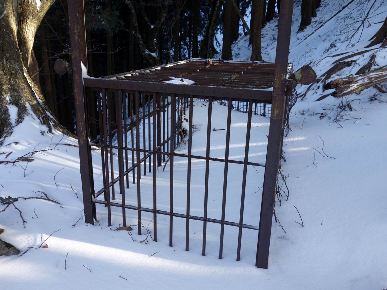 判官平からは北斜面の尾根を下ることにする。行きで出会った三人組が登ってきたルートである。それを確かめるように進むと、ここにもテープがあって結構歩かれているようだ。P1286の手前に檻が置いてあったが、入口が固く閉まっているので獲物は入らない。P1286から先もピンクのテープがあり、これに導かれるように下っていくとさらに急な傾斜になった。樹林帯の中に突入するとやがて木屋谷に沿いの山道に合流した。ここからは歩いたことはあるので一安心だ。ワサビ谷手前では固定ロープがあり慎重に下る。あとは山腹のトラバース山道を駆け足で進むとやがて万歳橋のたもとに辿り着いた。ここから林道を歩いて数分で駐車地に戻った。