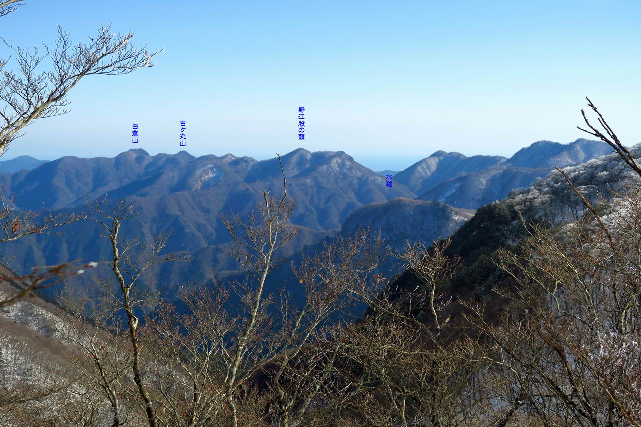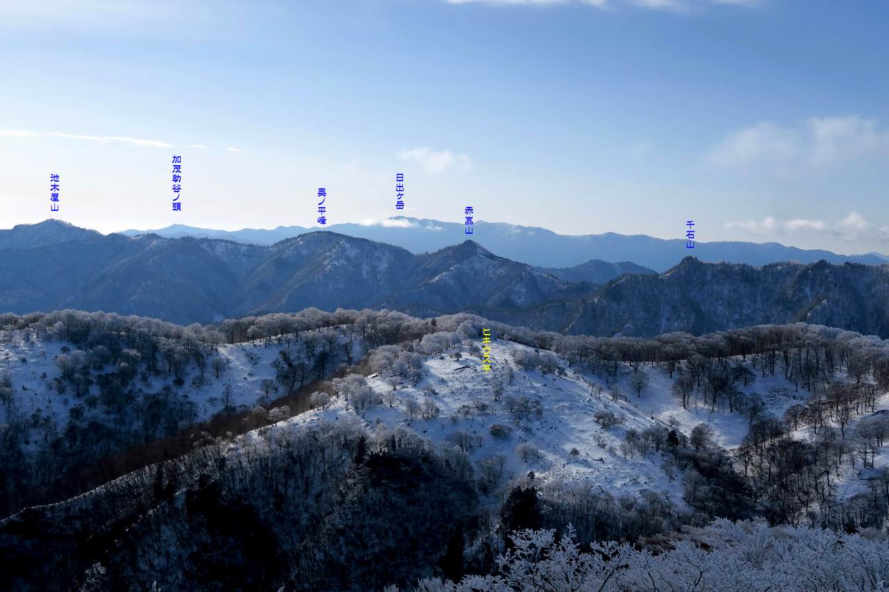 予報どおり朝早くから晴れており、太陽も昇ってきたので樹氷が落ちることが心配で予定を変更し、マナコ谷登山口(標高760m)からまず桧塚に登ることにした。マナコ谷の左岸に取り付きがあり、植林帯の中をジグザグを切りながら登っていく。途中に明確な作業道(杣道)があるが、登山道はこれを何度も横断しながら登っている。やがて造林小屋に出会うと、支道を右に取って少し進むと植林と自然林の境界線を登っていくことになる。このあたりから雪が出てきた。どうやら昨日のものと思われる複数人のトレースがある。気温が低かったせいか、踏み跡が今もはっきりと残っている。やがて樹林の中から飛び出した。広々とした尾根が桧塚のある主稜線に続いている。雪面に残ったトレースを追いながら一歩ずつ登っていくと、景色が広がってくる。前方には樹氷のついた樹木が「おはようごさいます」と出迎えてくれる。右手には、台高主稜線にある水無山、国見山、赤ゾレ山と連なって見えているが、後ろを振り返ると、台高山脈北端の高見山があり、その尾根筋には三峰山、修験業山、栗ノ木岳、局ヶ岳などが続いている。その向こうには特徴ある室生火山群の住塚山、鎧岳、兜岳、倶留尊山、大洞山が並んでいる。主稜線に出ると樹木にたくさん樹氷がついているが、風も少しあって寒く、手がかじかむ。まずは桧塚にあいさつに行くことにした。少し下って登り返すと桧塚の三角点が雪の中にあった。