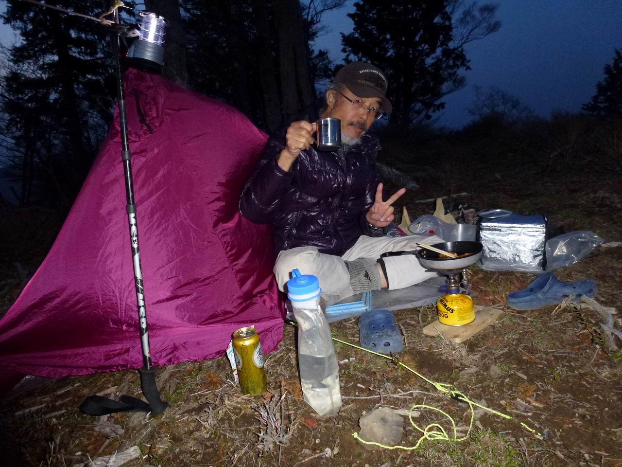 ヒキウス平からはP1394まで戻り、明神平方面に向かうと、明神平からやってくる登山者とすれ違うようになった。判官平付近でおやっと思う三人グループがいた。やってきた方向が明神平方面ではなく北斜面からだ。聞くと万歳橋から木屋谷沿いの山道を歩いて、途中から尾根を登ってきたという。これは帰りに予定しているルートではないか。まあ帰りに確認してみることにして先に進もう。トレースの跡をそのまま進むのは嫌なので、ちょっと外したところを歩いてしまう。それだけエネルギーがいるのであるが、何せ性分なので仕方がない。明神岳(1432m)手前の急登を終えると左折して笹ヶ峰に向かう。このあたりも再び樹氷が大きく育っている。笹ヶ峰にもトレースがついている。ここからは下っていくことになるが、3つの小ピークを越えて4つ目のピークが笹ヶ峰(1367m)である。2つ目のピークが1380mと最も高く、この辺りはブナが林立して気持ちがいいところである。笹ヶ峰には12:15に到着した。ちょうどランチタイムとなった。少し東に寄ったところのブナの下に腰を下ろした。今日はお決まりの得正のカレーうどんだ。「福ヱビス」のビールがうまい!天気がよく太陽が照りつけて樹氷が溶けてバラバラ落ちてくる。また、それも乙なものである。笹ヶ峰は東西に長い台地状になっているが、東に行ってみると黄色のテープが続いている。少し東に歩いてみたが、どうやら千石谷に下っていくようである。