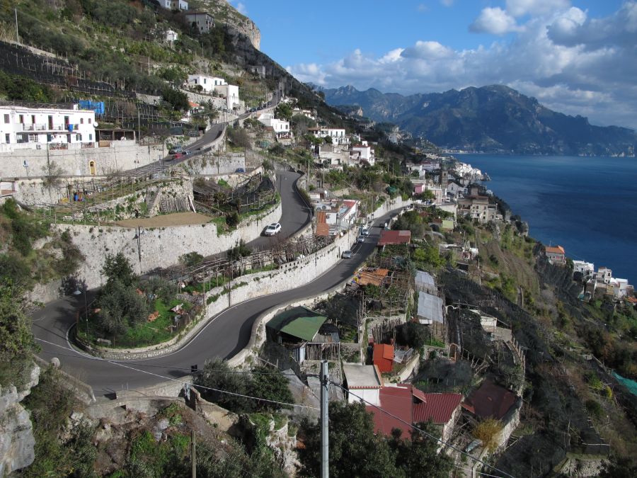 町を抜けて林道を進んで行くと眼下にはアマルフィ海岸の絶景が望めるようになった。車外に出てみると猛烈な風が吹いて立っているのがやっと。