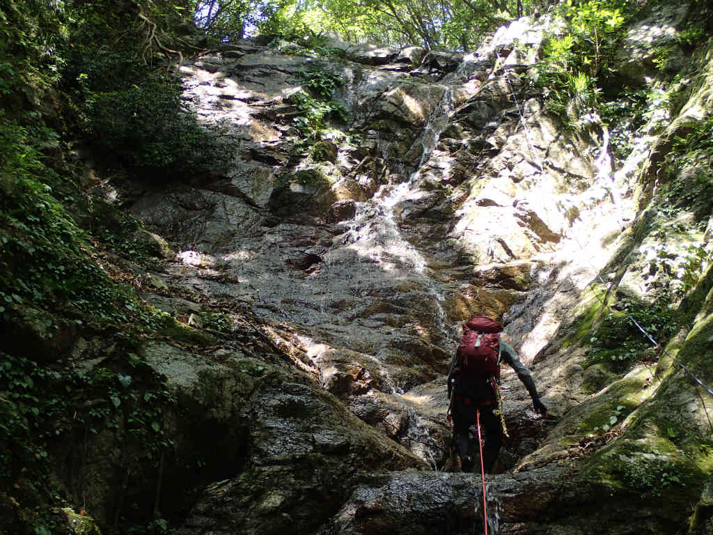旧国道の橋の下をくぐると最初の10m滝。フリーでも登ることができるのだが、今日はロープウエー訓練なので遊びでロープを出すことにする。取り付きののっぺりとしたスラブがちょっと湿っており、ぬめる。一歩離陸すればあとは簡単だ。岩のリスにハーケンを一本打つ。これも練習。登りきって、わりばしさんを確保する。最初の離陸に苦労しているようだ。わりばしさんも登りきって、一旦懸垂下降で下におり、今度はわりばしさんのリードで登り返す。二人で全ての滝をリードとフォローを1回ずつ経験しながら登っていこうという趣向だ。一つの滝を2度楽しめる結構な企画なのだ。