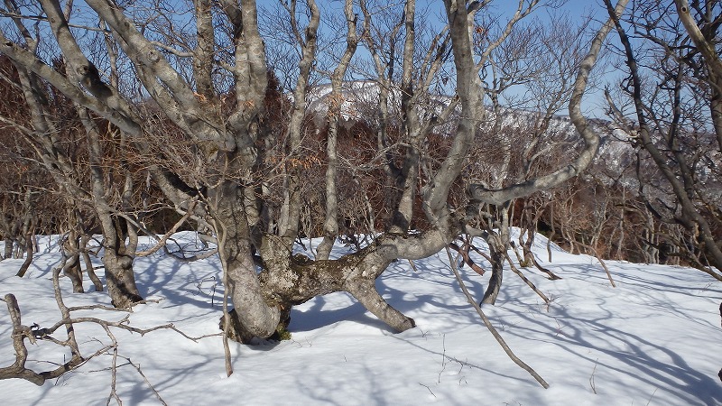 北尾根は両サイドの眺望と併せ、大小のブナが雄姿、奇形、異種コラボの楽しさを堪能させてくれる。