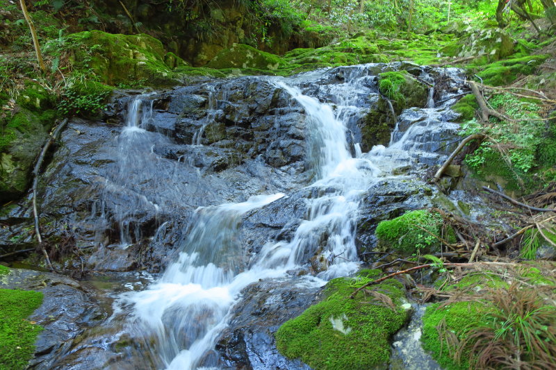 下山は植林の中を一直線に谷へ向かう。下り着いた谷底もやはり植林には違いないが、苔むした岩とナメの美