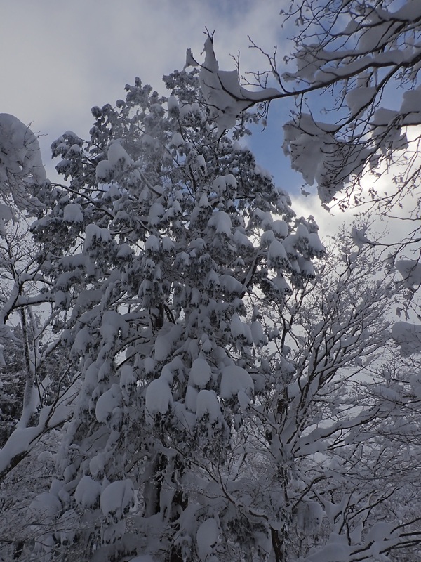帰りはお藤の鼻筋から下ろうと考えていたが聖宝寺道への新雪のトラバースが嫌になり、小屋裏の丘から聖宝寺道分岐に向けて真っ直ぐに下ることにした。下りだすと小屋付近の喧騒は消えさり、深い雪で快適に下っていける。大貝戸道の登山者はトレース以外を歩かないのできれいに整備された溝のようだった。