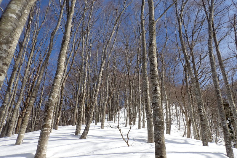 少し早めにランチを切り上げて、ほぼ空身で山頂への稜線へ踏み出した。すぐに美しいブナ林が始まる。