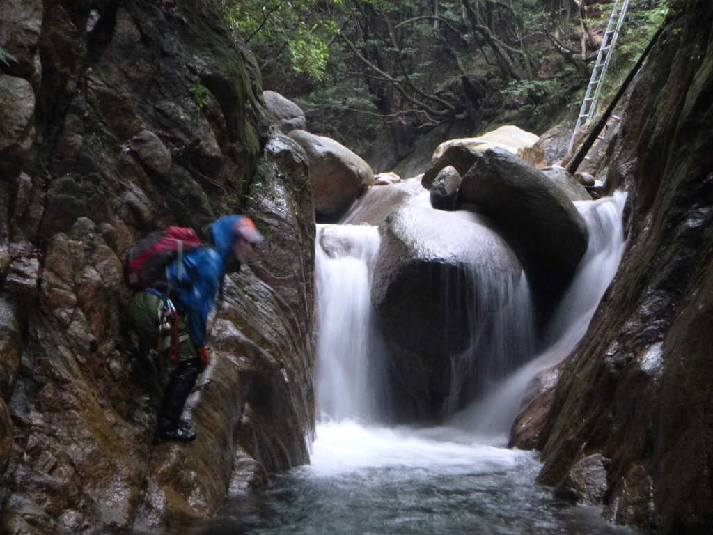 七ツ釜の廊下は流れを突っ切って侵入し、最後は大岩の右側を登る。切り込み隊長のなおちゃんがロープをつけて登る。一度落ちるがなんとか登頂に成功、後のメンバーを引き上げる。昨日からの雨で増水しているので難度が上がって楽しい.