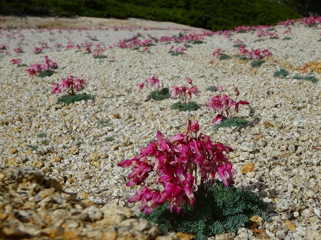 白砂の斜面にはピンクのコマクサが一面にまばらに咲いている。