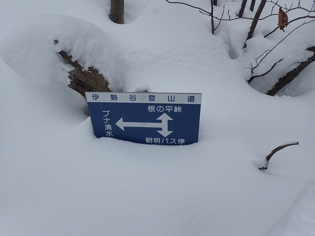 根の平峠の手前のブナ清水との分岐に来た。ブナ清水への道にトレースはない。雪はたんまりだ。これを行ったらどんなことになるだろう。ブナ清水までは結構登るのだ。うーん、頑張っていっても今日はブナ清水までで終わってしまうかもしれない。
