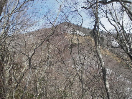 もう一つコブを越えると綿向山に向かって登りが始まる。見えているのは南東の肩だ。 登って行くと南東の斜面が大きく崩壊していて水無山ルートの文三ハゲにそっくりだ。