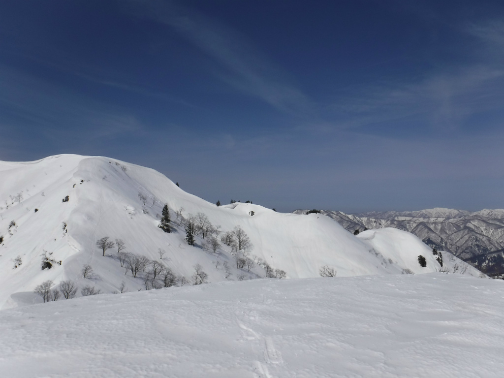 前に金糞岳に登った時から思い描いていたコースを雪質にも天候にも恵まれ楽しむことができた。今回は雪質が良かったので時間的には早く歩けている。なにせ長丁場なコースなので時間に余裕を持って歩くのがいいと思う。