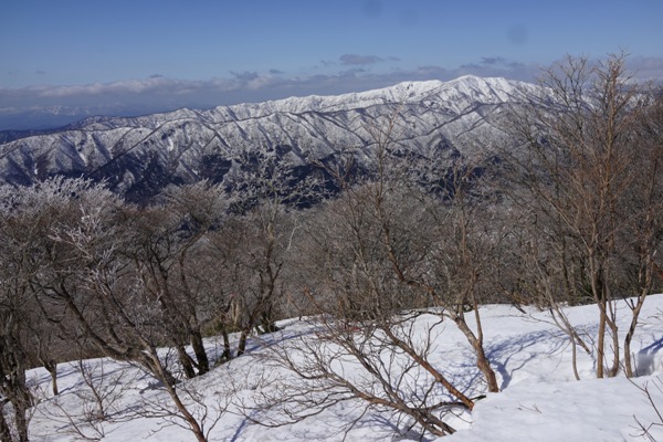 奥山の手前で先行する3人パーティを抜き、山頂で一緒になった。はるか先に白倉岳と金糞岳の白い雄大な山容が見える。特に白倉岳の白さは際立っており存在感がある。パーティのリーダーは先週も花房尾を登ったようだ。もう一人単独男性に追いつきそうになったのだが、ギアを上げたようで足跡だけを残して消えた。