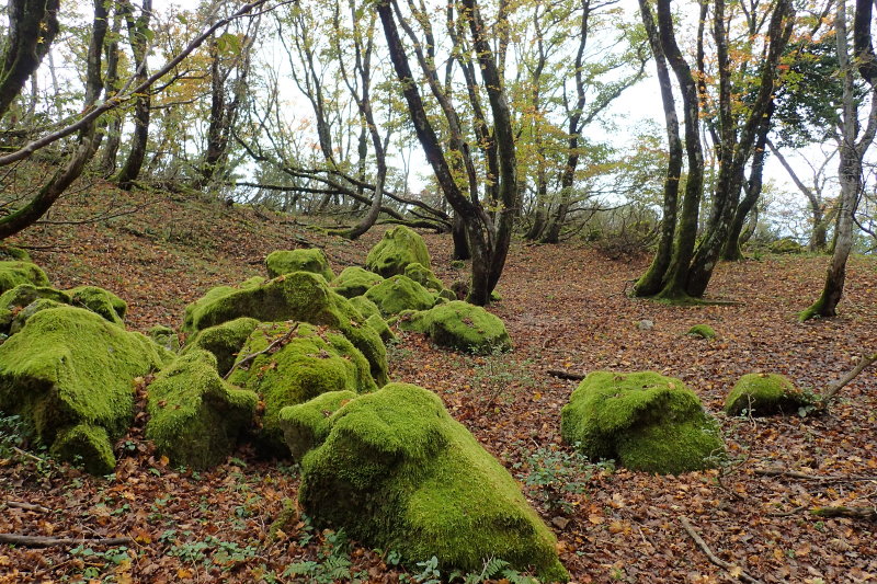 と思われる小さな池が現われたいい場所だ。樹林はほんのりと色付いて、苔むした岩と共に、うっすらとかか