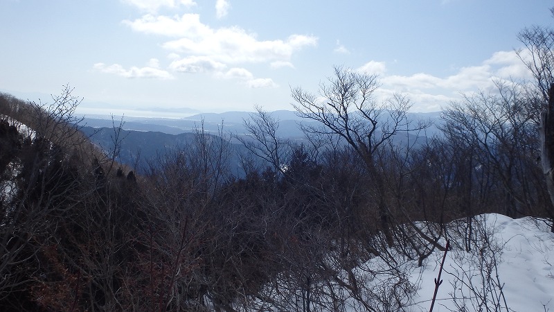 西側の若狭湾は雪のない周りの山とともに黒々と横たわり、真冬というよりすっかり春の装い。この山頂も吹きだまりで50~60cm、風の強い稜線は10cmほどしか雪がない。
