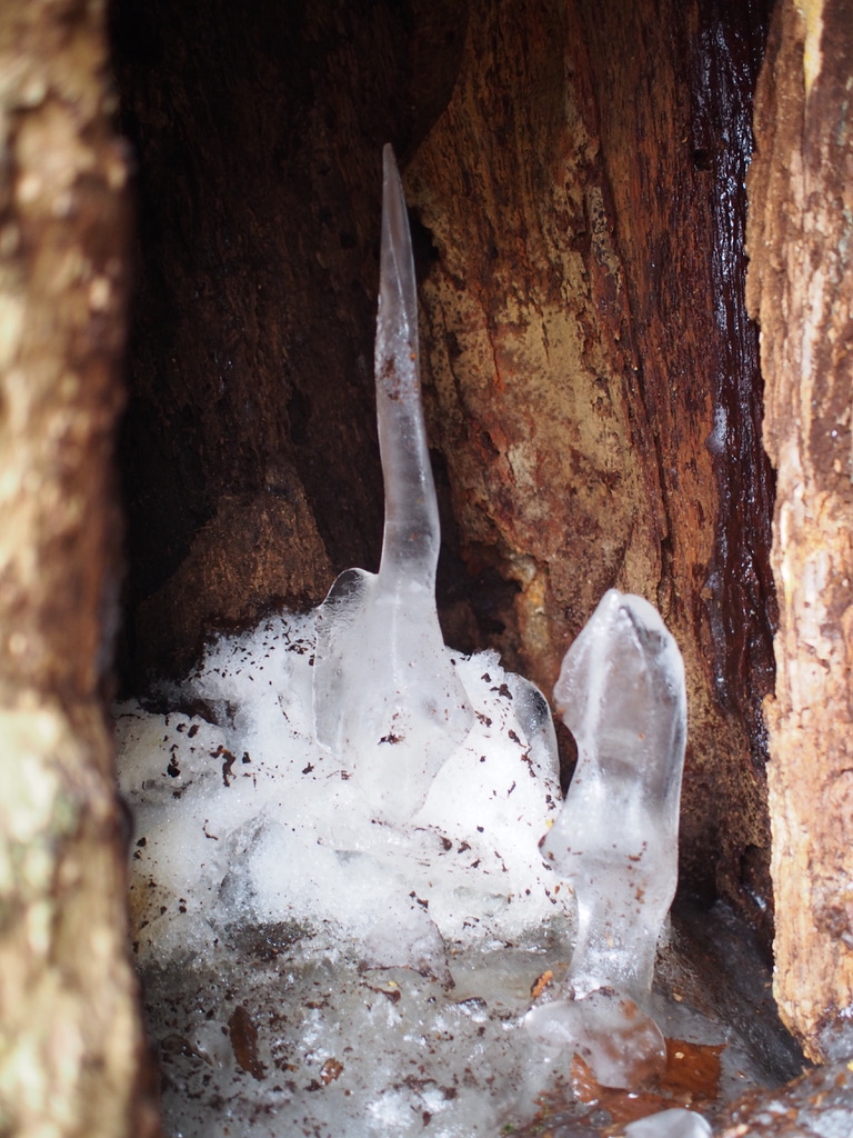 好展望はここで終わり、下山はブナの立ち並ぶ尾根を下降してゆく。やがて遠目にもそれとわかる大樹が尾根の中央に現れる。これが噂のミズナラの大樹のようだ。樹の中には洞が形成されており、その中を覗き込むとまるで祠の中に祀られたお地蔵様のように氷荀が鎮座しているのだった。長い氷荀の一本が折れてしまっていたので、立て直してみる。