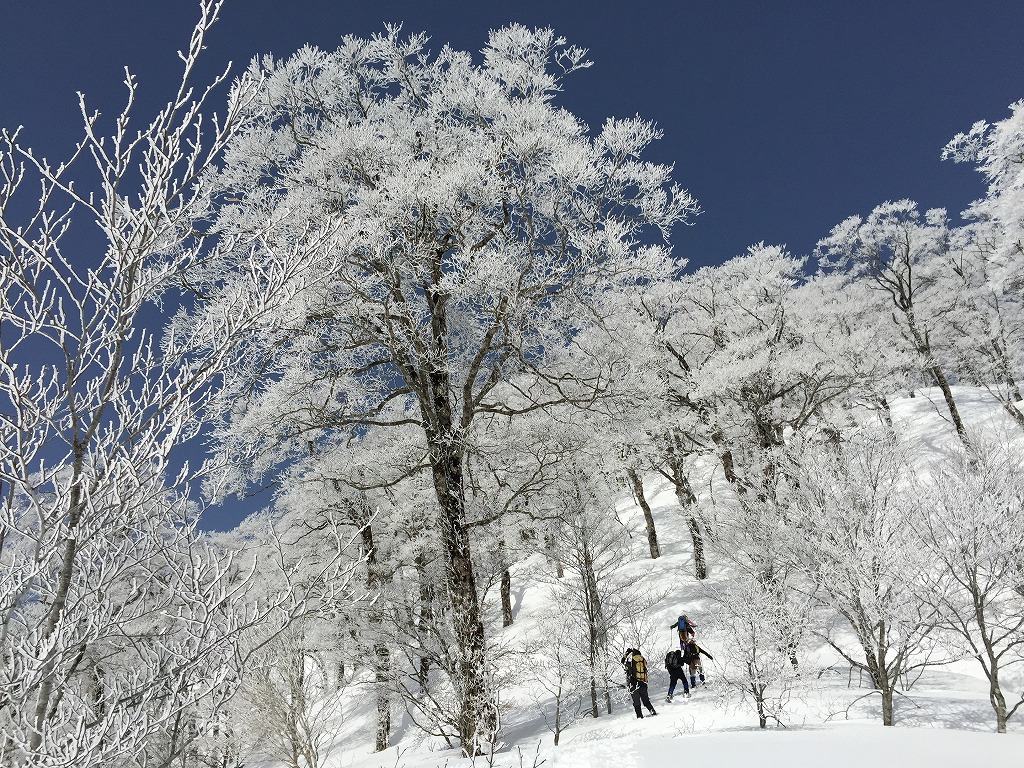 やがて尾根が一本に収束すると別の歓声を上げることになる。早くも霧氷が始まったのである。雪庇の反対側に霧氷を纏った樹々が整列する様はまるで霧氷の並木道だ。山日和さんを始め数人は尾根のすぐ直下の緩やかな谷筋を登られるが、なだらかにカールした谷筋も気持ち良さそうだ。
