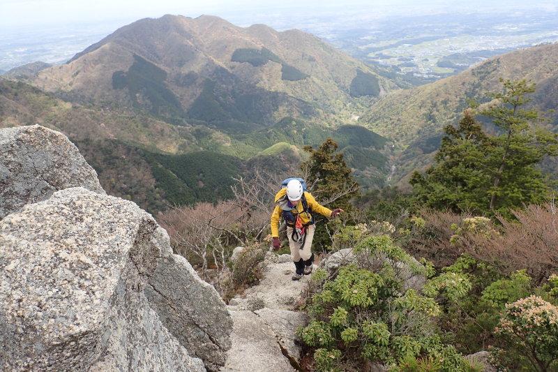 に岩壁のトップまで抜けることができた。振り返ると、岩稜の向こうに伊勢平野と伊勢湾の眺めが広がる。