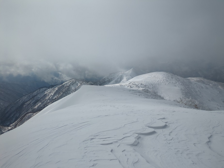 前山からは能郷白山の山頂はガスっていてよく見えない。風は時より強く吹き寒い。
