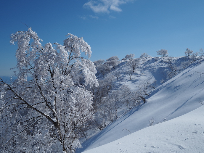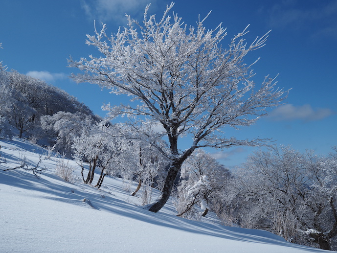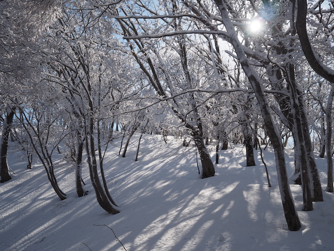釣瓶岳の山頂からはすぐにナガオの尾根に入る。広々としてなだらかな尾根はまるで霧氷の迷宮のようだ。霧氷の樹々の間からこぼれ落ちる陽光が雪の上に明瞭なコントラストを描いている。先に進むにつれ樹々の間から正面に武奈ヶ岳の姿が大きくなってゆく。ナガオの尾根が南東に向かって大きく曲がるところで、尾根を直進し、広谷に向かって下降する。