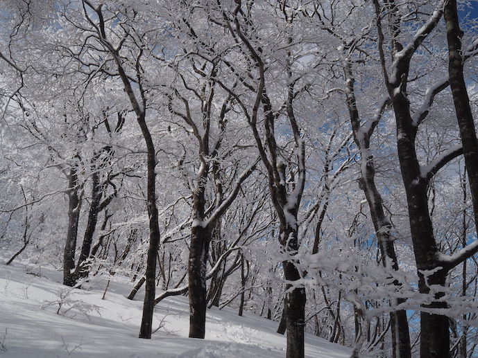 この北稜が魅力的の一つはブナの叢林から離れてところどころに点在するブナの孤樹の佇まいだ。尾根上の樹々には雨氷の表面にさらに霧氷がびっしりと発達しているようだ。美しい樹影に出遭うたびに歩みを止めることになるので、なかなか先に進めなくなる。高度が上がるにつれ樹々の表面を覆う樹氷は普段よく見るような霧氷へと変化した。