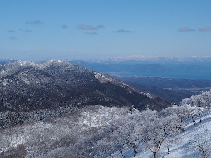 琵琶湖の対岸には冠雪した伊吹山、金糞岳が見えるが、横山岳のあたりに視線を移すと、横山岳の山の姿がよくわからず、代わりにその彼方に白く大きな山が見えているのだった。白山だ。白山から手前には重畳と連なる山々が見えている。少し手前で左手に見える白くなだらかな山は上谷山だろう、対照的に右手に見える三角錐状の鋭鋒は蕎麦粒山に思われる。