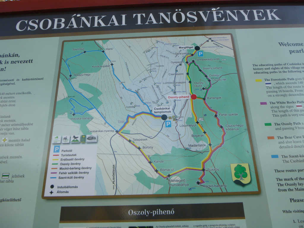ブダ山地の地図にはコースにいろいろなマークがついて,それが実際のコース上のマークと一致しているので,簡単にトレッキングコースを理解することができた.今度の地図にはマークがなくて,コース上にP, S, Zなどの文字が書いてある.これはなんなのだろうと不思議に思っていたのだが,実際に来てみるとブダ山地と同様のマークがあった.どうも,色を文字で表しているらしい.たとえば,Pは赤,Sは黄である.P+だと赤い十字マークという意味らしい.単なるPは赤棒である.なるほどそうなっているのね.ということで問題解決.