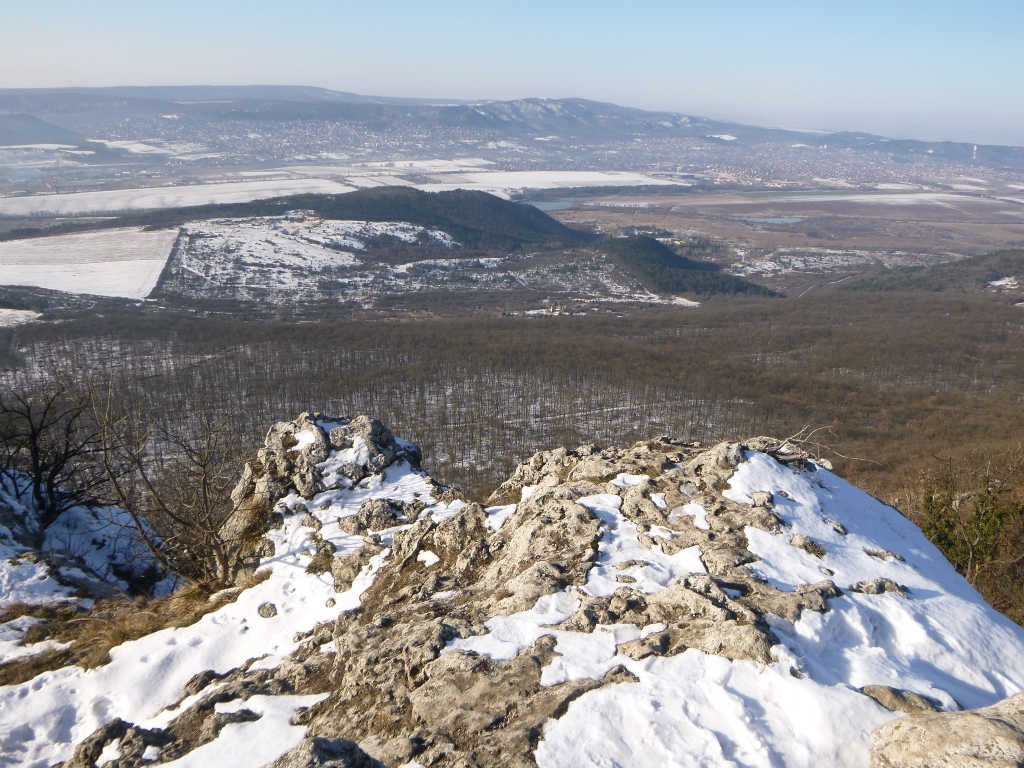 そこを過ぎ,ナジケベリー山 534m山頂手前に御池のボタンブチのような切り立った岩場があったので休憩していくことにする.標高500mほどなので大して高くはないが,岩場は100mほど切り立っており,ここから落ちると助からないよなーと思いながらいつもの習性で崖の近くまで行って休む.風はほとんどなく,ピーカンである.おそらくこれまでの山歩きの中で最高の天気だろう.日差しが強いので,風さえなければ驚くほど暖かい.南西方向にはこれまで歩いてきたブダ山地が遠くに見え,自分が歩いたルートを辿ってみる.日本の山とは景色が全然違うが,それでも自分が歩いてきた山は愛おしい.